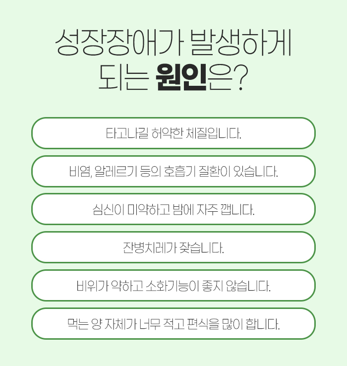 타고나길 허약한 체질이거나 비염, 알레르기 등의 호흡기 질환을 앓고 있다면 건강도 좋지 못하지만 성장에도 좋지 못합니다. 또 심신이 미약하고 밤에 자주 깨거나 잔병치레가 잦은 경우, 비위가 약하고 소화기능이 좋지 못한 경우, 먹는 양 자체가 너무 적으며 편식을 많이 하는 경우도 마찬가지인데요.