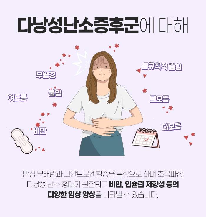 그리고 다낭성난소증후군을 앓게 되면 흔히 나타나게 되는 증상에는 흔히 생리를 하지 않는 무월경과 불규칙적인 출혈, 난임, 여드름, 비만, 탈모증, 다모증 등이 있는데요.