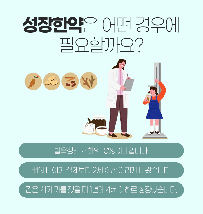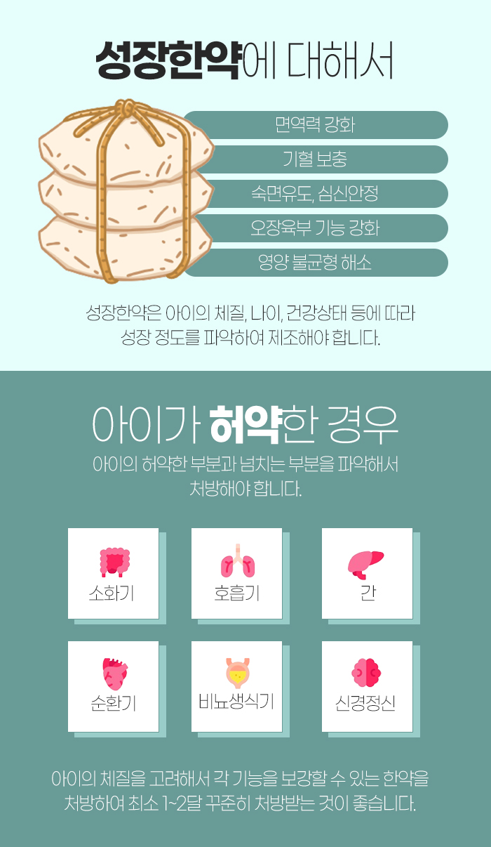 그리고 아이의 성장이 더딘 이유에 대해 살펴보면 타고나길 체질이 허약한 편이거나 비염이나 알레르기 등의 호흡기 질환을 앓고 있어서인 경우도 있고, 심신이 미약하고 밤에 자주 깨서, 잔병치레가 잦아서인 경우도 있습니다. 또 비위가 약하고 소화기능이 좋지 않거나 먹는 양 자체가 너무 적은 데다 편식을 많이 해서인 경우도 있는데요.