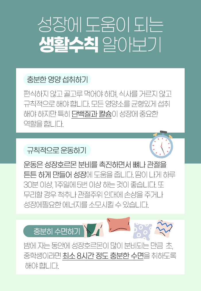 그리고 수면을 충분히 취해야 하는데요. 밤에 자는 동안 성장 호르몬이 많이 분비되기 때문에 초등학생이나 중학생이라면 최소 8시간 정도 수면을 취하도록 해야 합니다.